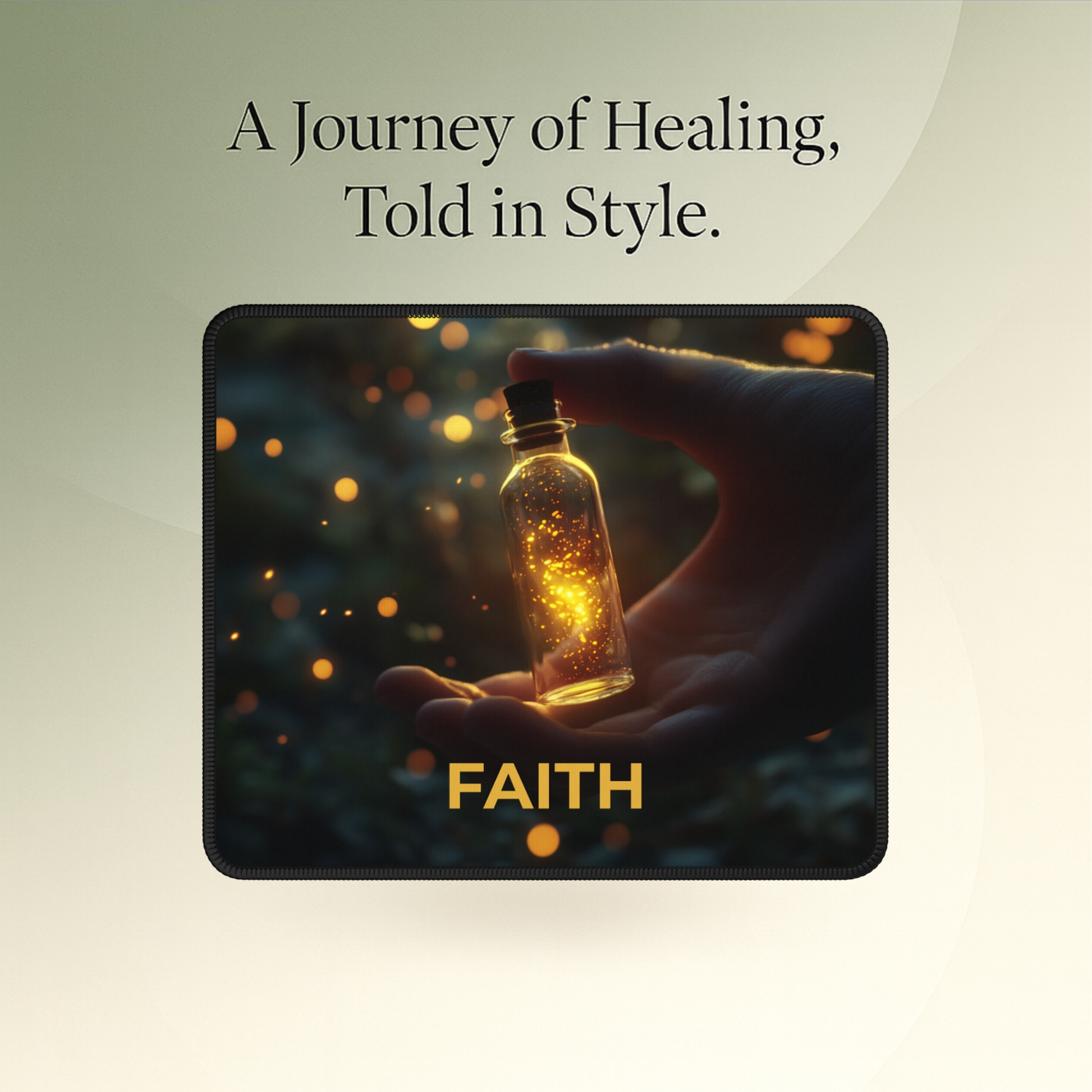 This inspirational mouse pad features a softly glowing bottle of light held in caring hands—symbolizing hope, trust, and quiet strength. The word FAITH, set in warm golden tones, serves as a gentle reminder that even in the darkest moments, light is always present.