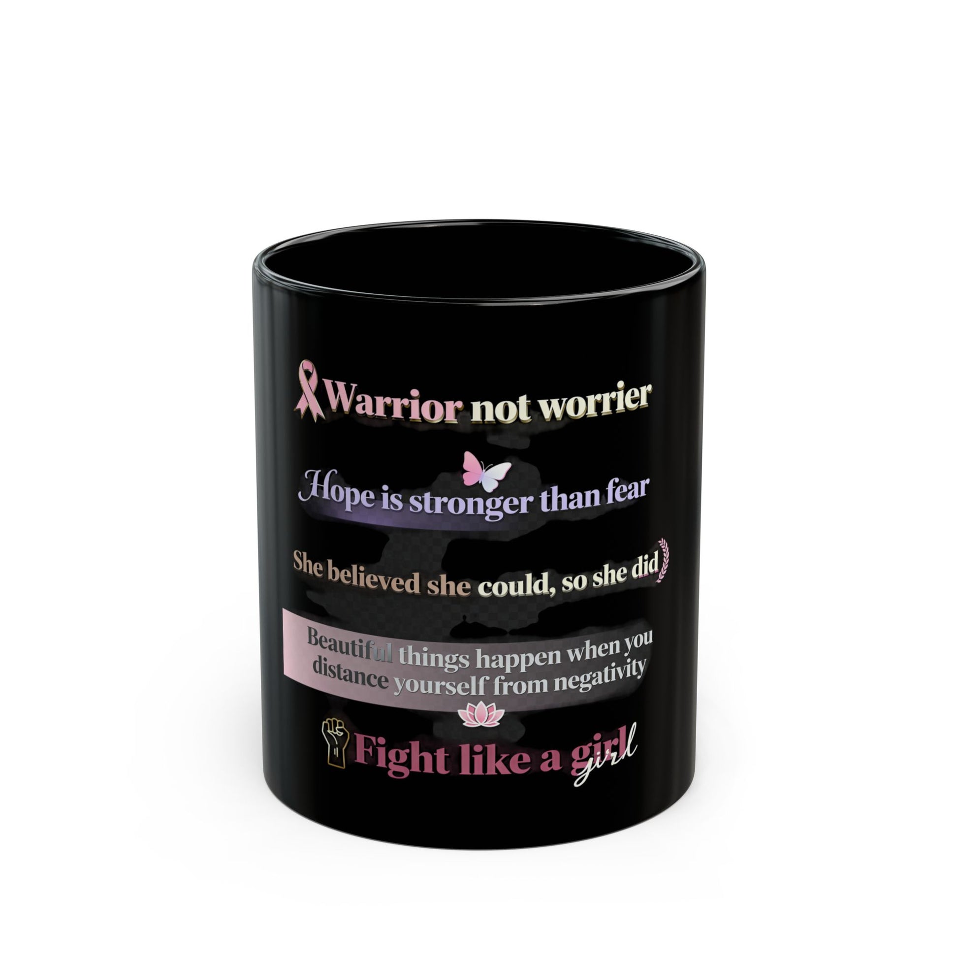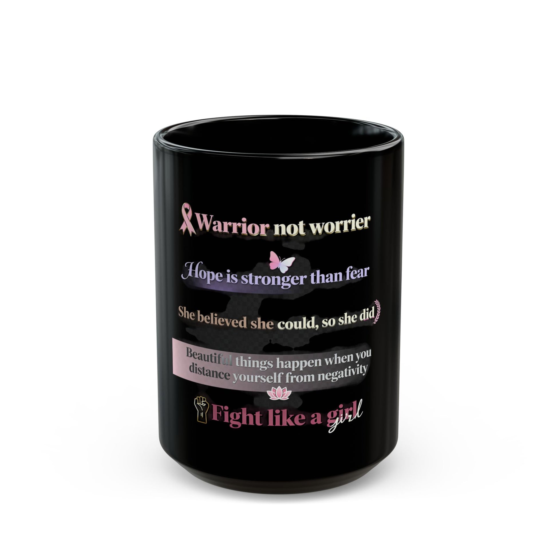 Introducing our elegant Black Mug, designed to inspire and uplift. With empowering quotes such as "Warrior not worrier" and "Fight like a girl," this mug brings a positive vibe to your daily routine, making every sip a reminder of strength and resilience. Perfect for morning coffee or evening tea, this mug fits seamlessly into the life of anyone who appreciates motivational messages. Great for busy professionals, students, or anyone who embraces a warrior spirit. Ideal for gifting during occasions like birthdays, International Women's Day, or as a thoughtful gesture for someone facing challenges. Enjoy your favorite beverages in style while embodying the spirit of courage.