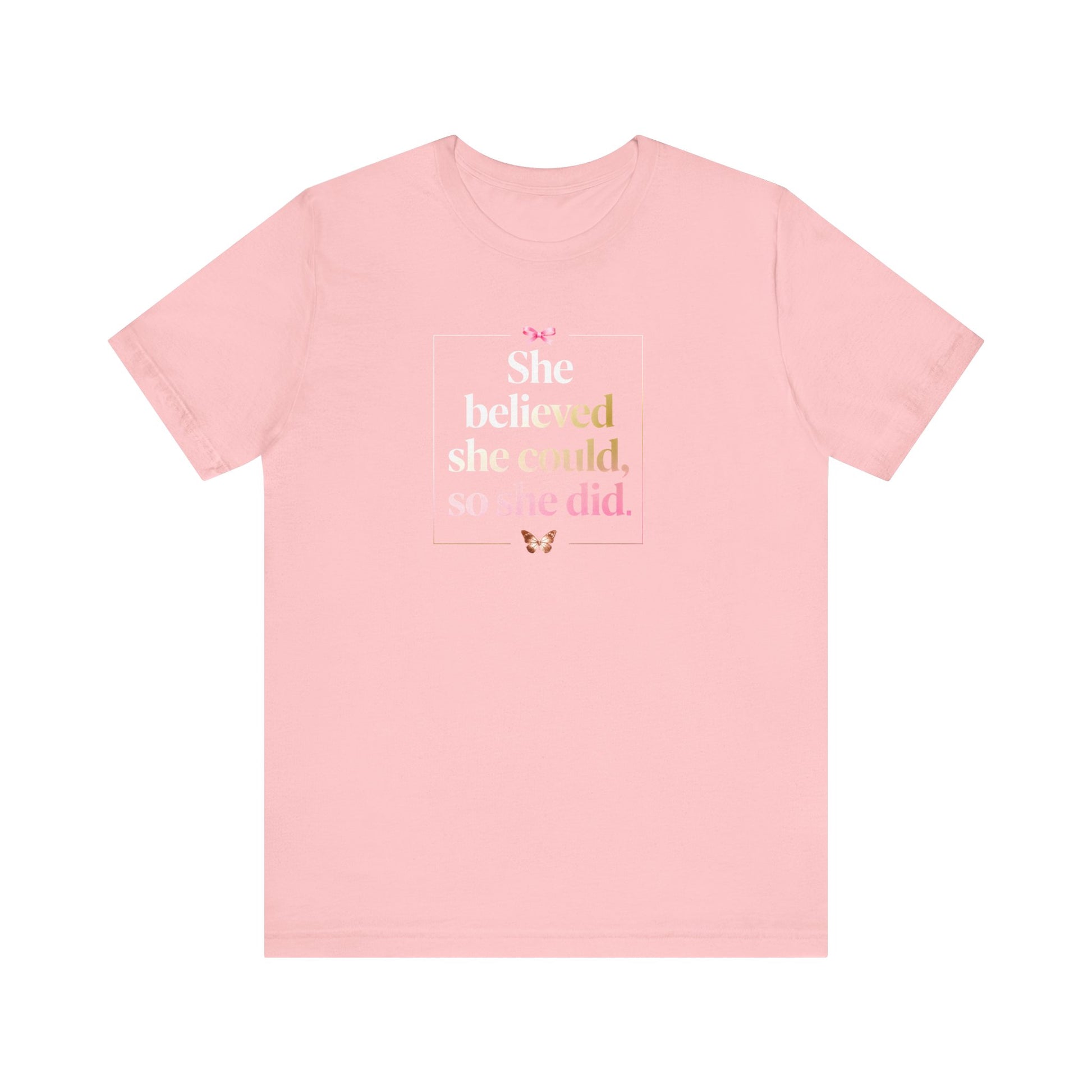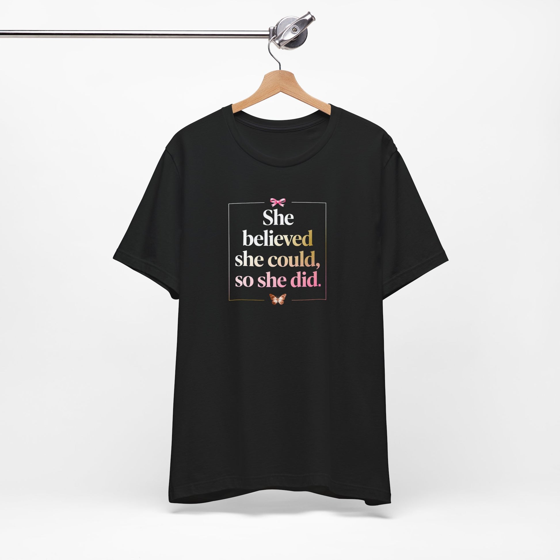 This Unisex Jersey Short Sleeve Tee is perfect for those who seek inspiration and a touch of empowerment. With the uplifting message, "She believed she could, so she did," this tee radiates positivity and determination. It's ideal for casual outings, workout sessions, or simply lounging at home. The lightweight, breathable fabric makes it a comfortable choice for everyday wear. Perfect for gifting during Women's Day, graduations, or any celebration of achievement, this tee appeals to anyone looking to inspire themselves and others. Wear it to express your confidence and belief in possibilities!