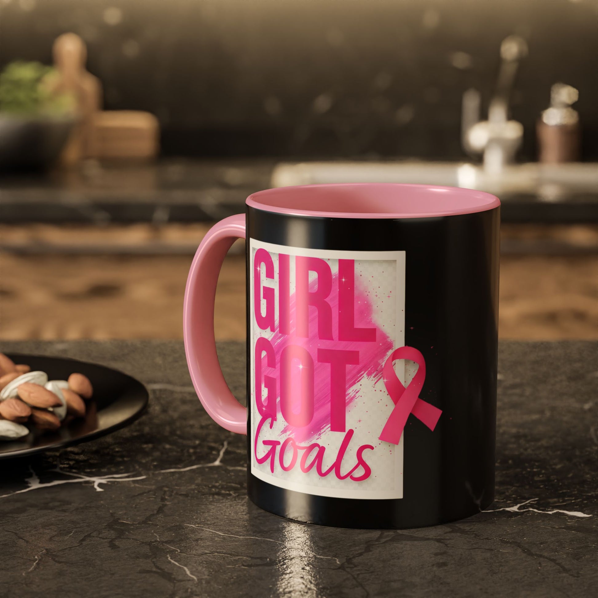 This breast cancer awareness mug features the empowering quote 'Girl Got Goals'. Perfect for starting your day with a reminder to stay focused and motivated. Ideal for those supporting breast cancer awareness and survivors, this mug is a thoughtful gift for loved ones or for yourself. Relevant for Breast Cancer Awareness Month and other cancer awareness initiatives.