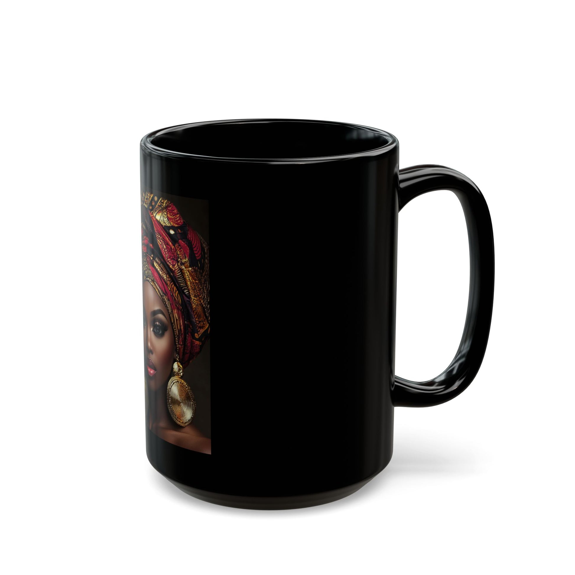 This striking black ceramic mug features a regal portrait of a woman adorned in a richly patterned headwrap and bold gold earrings—symbolizing heritage, resilience, beauty, and inner power. Her gaze reflects confidence, wisdom, and quiet authority.