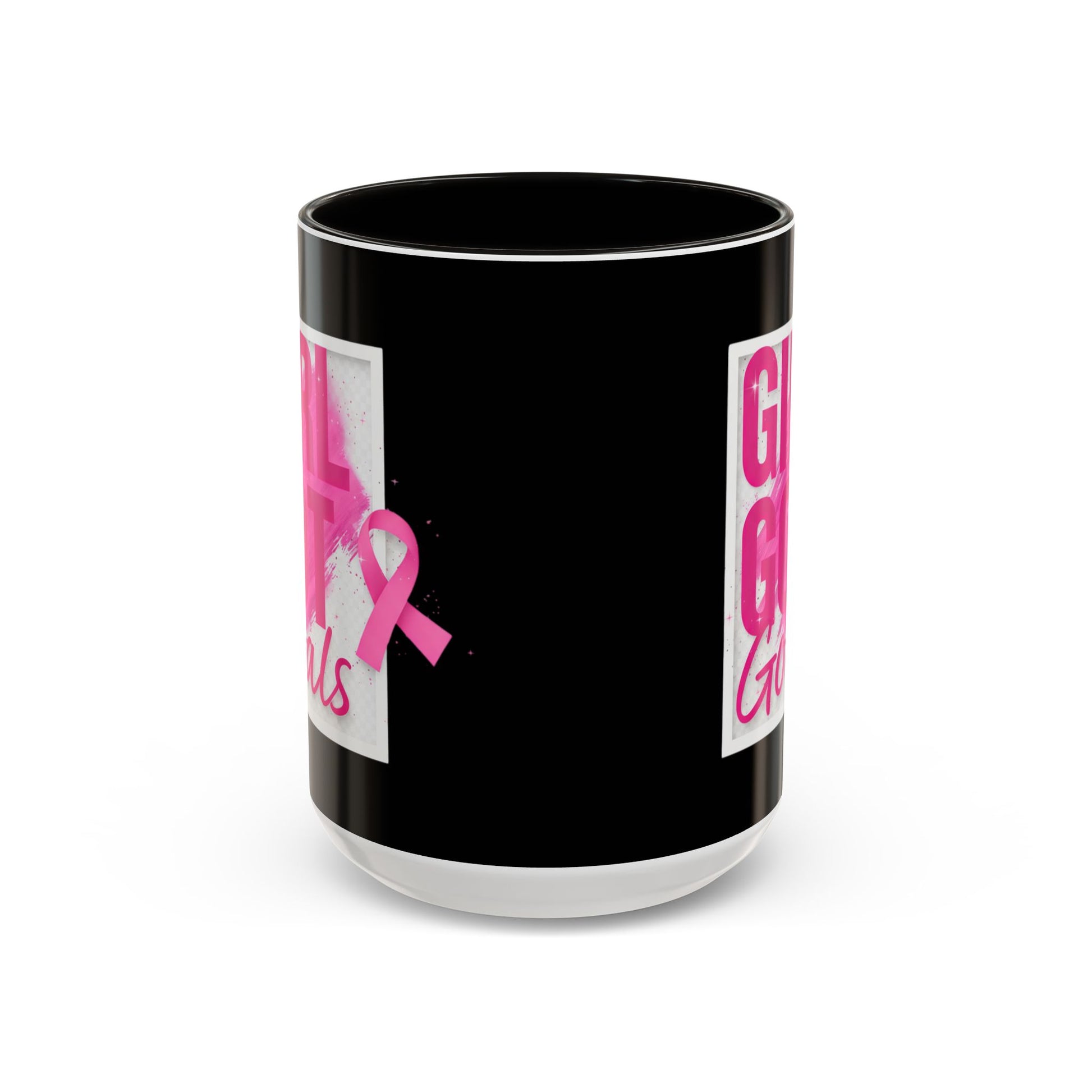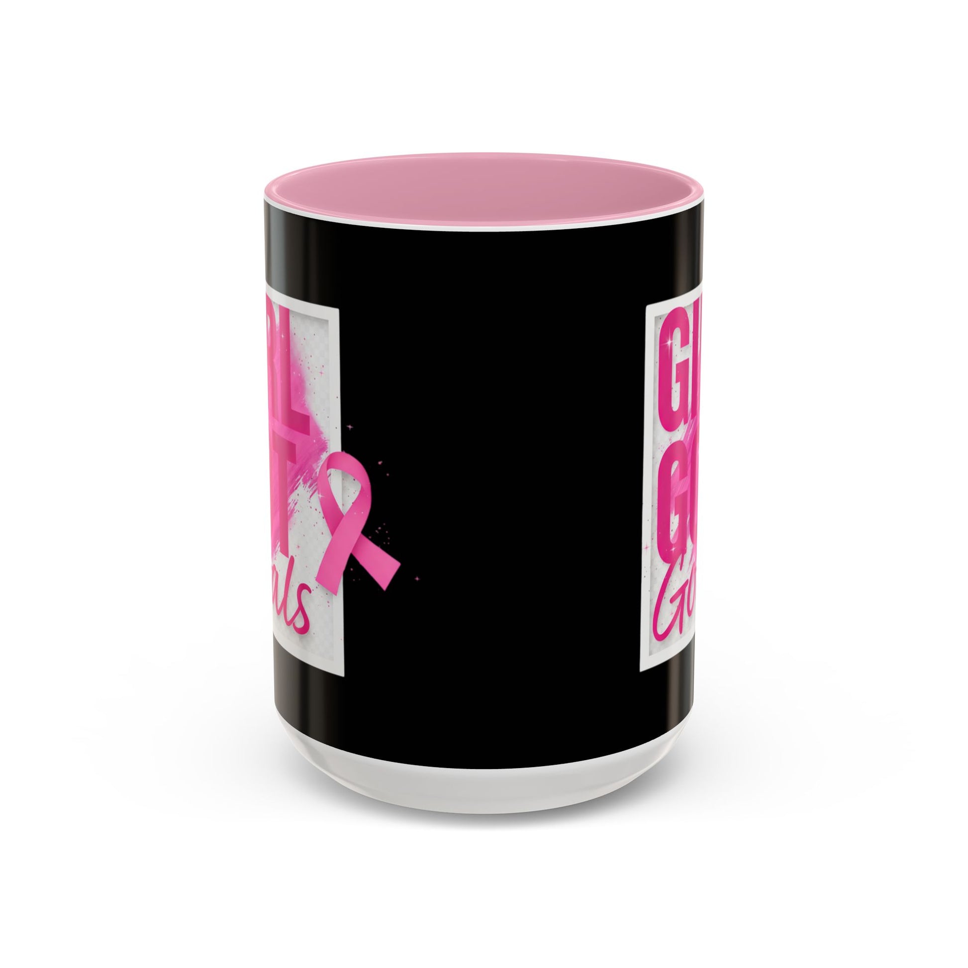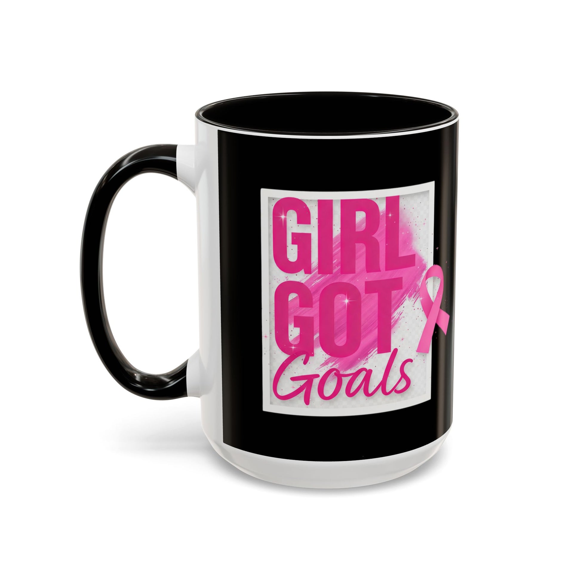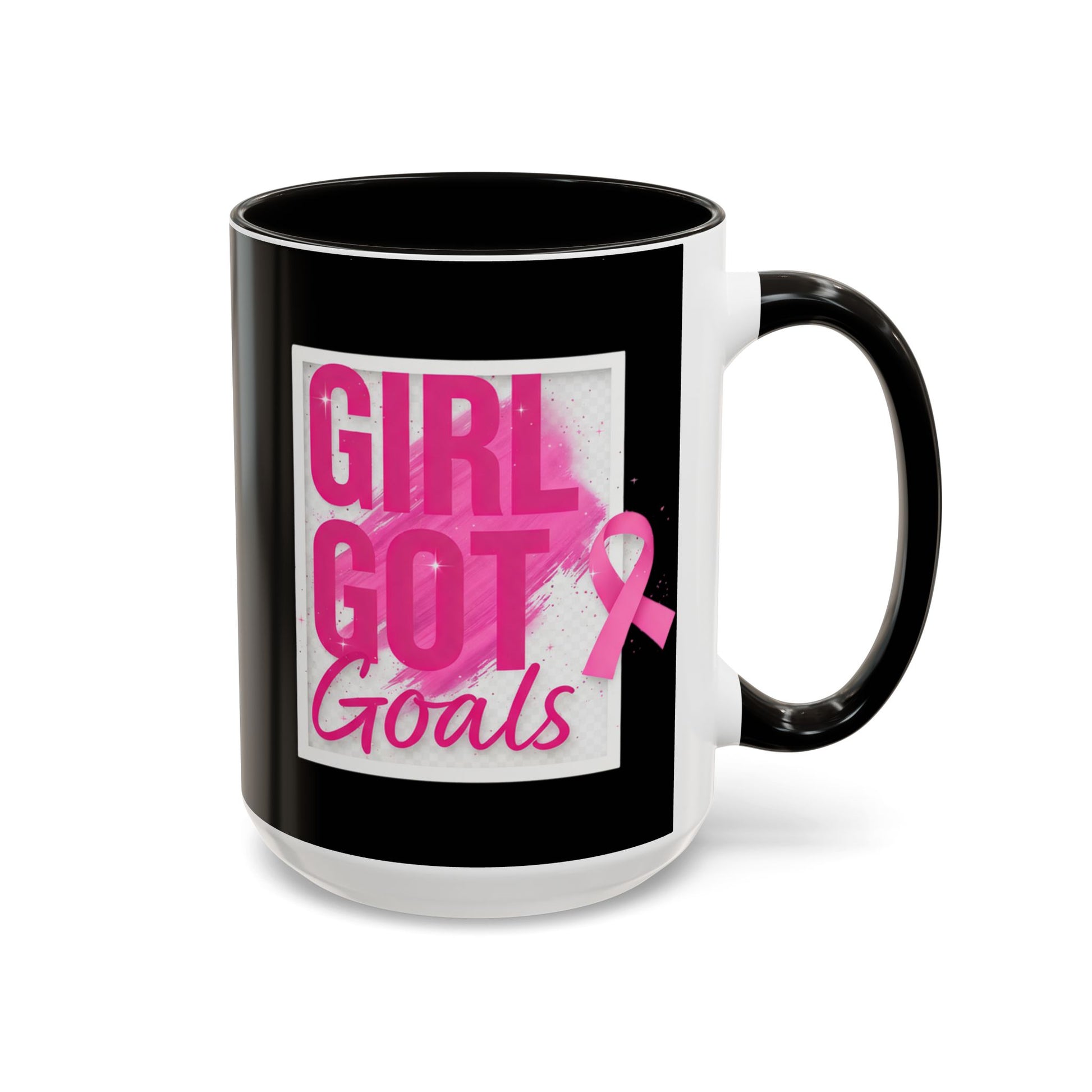 This breast cancer awareness mug features the empowering quote 'Girl Got Goals'. Perfect for starting your day with a reminder to stay focused and motivated. Ideal for those supporting breast cancer awareness and survivors, this mug is a thoughtful gift for loved ones or for yourself. Relevant for Breast Cancer Awareness Month and other cancer awareness initiatives.