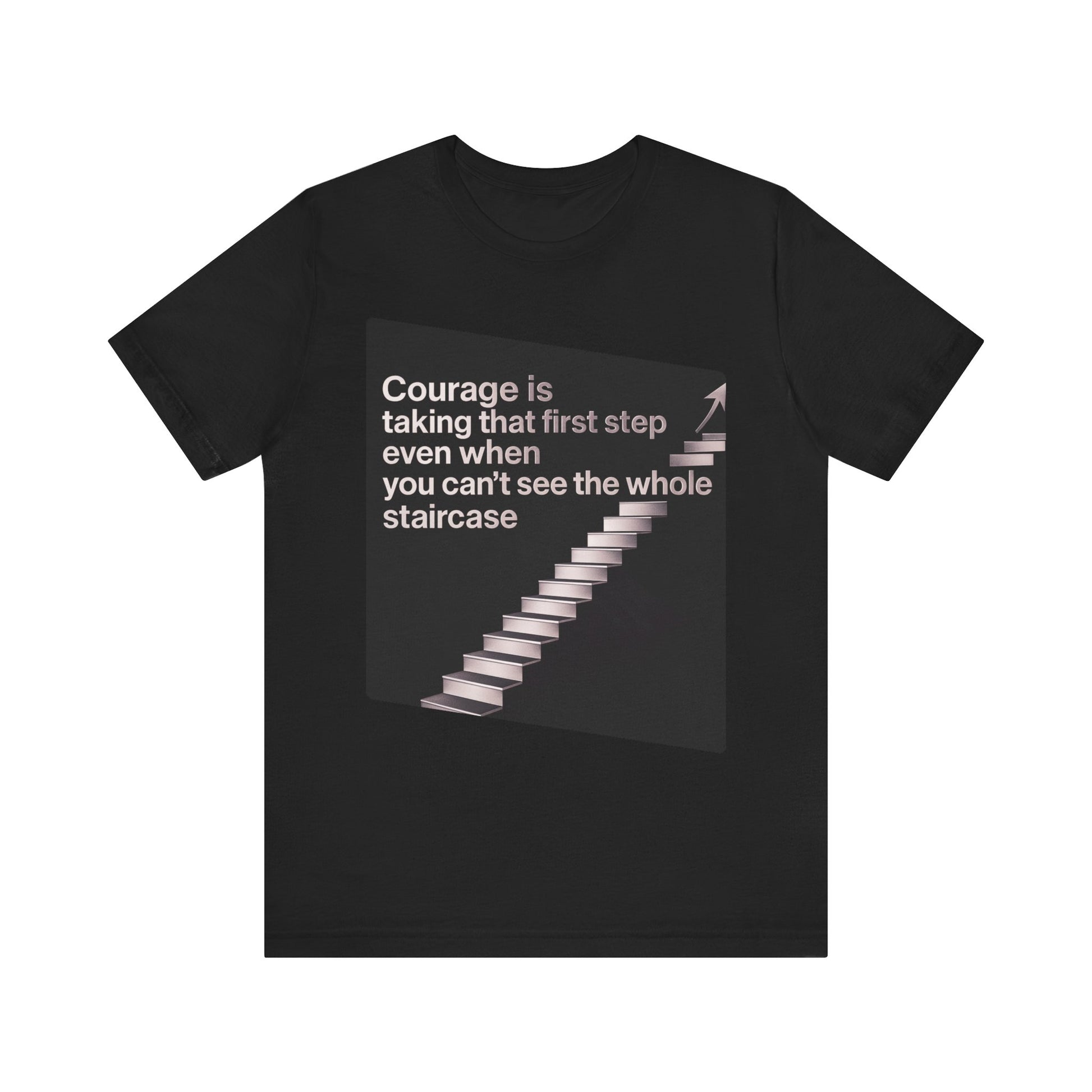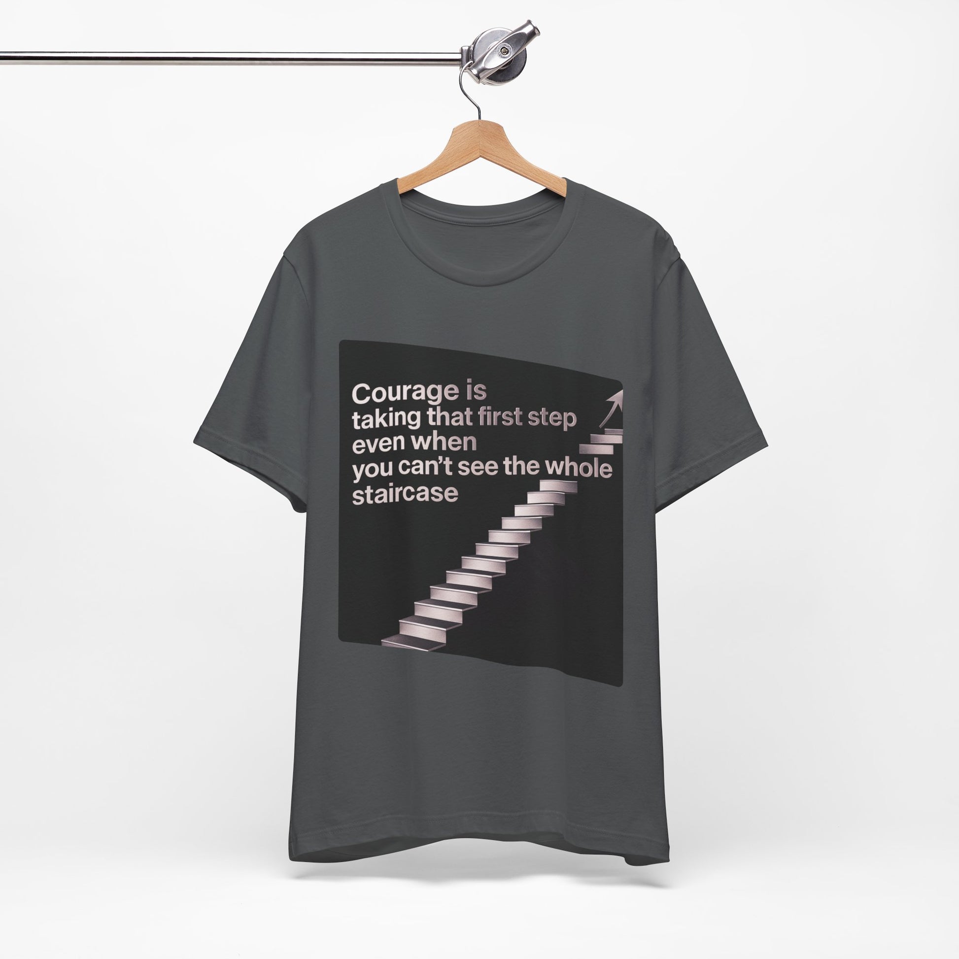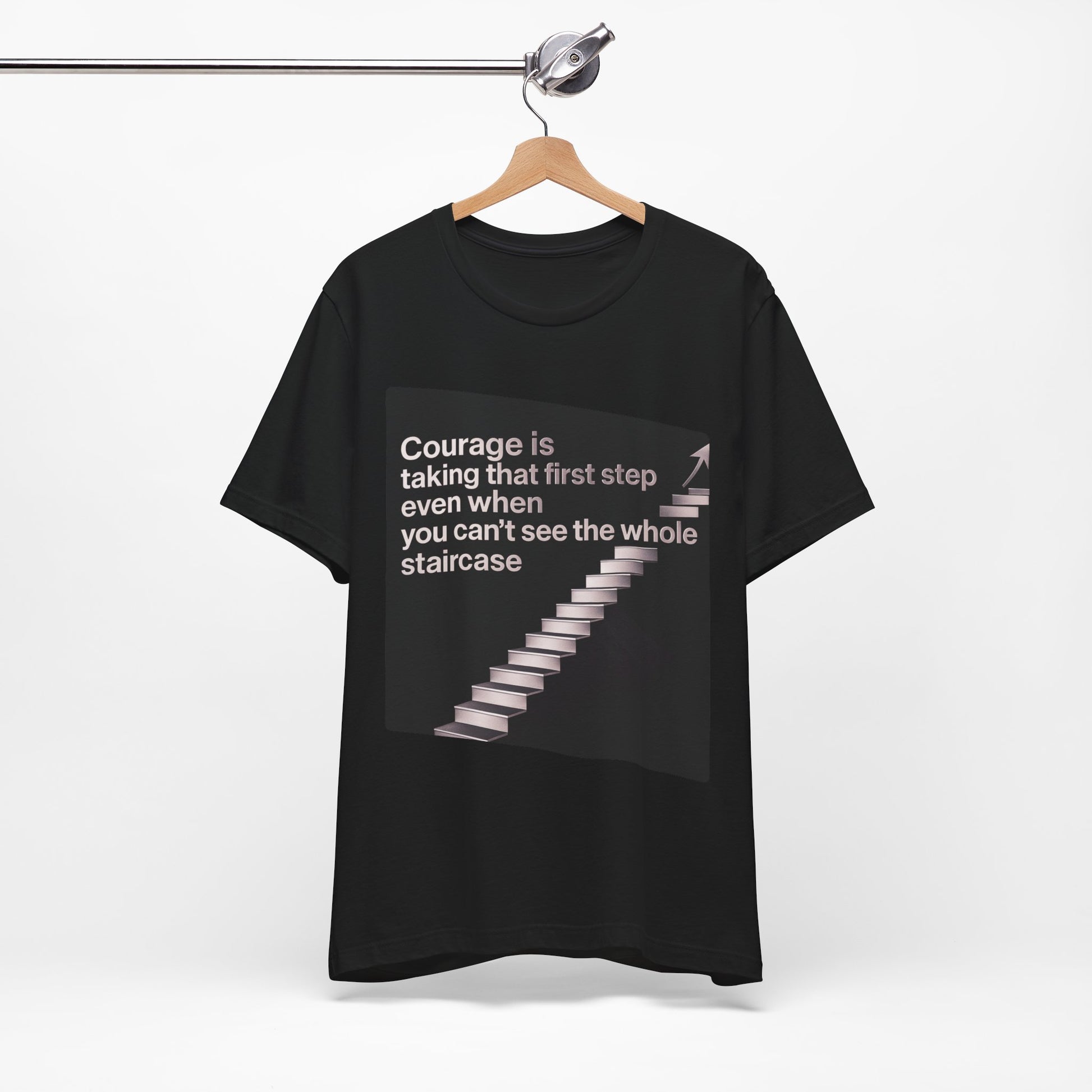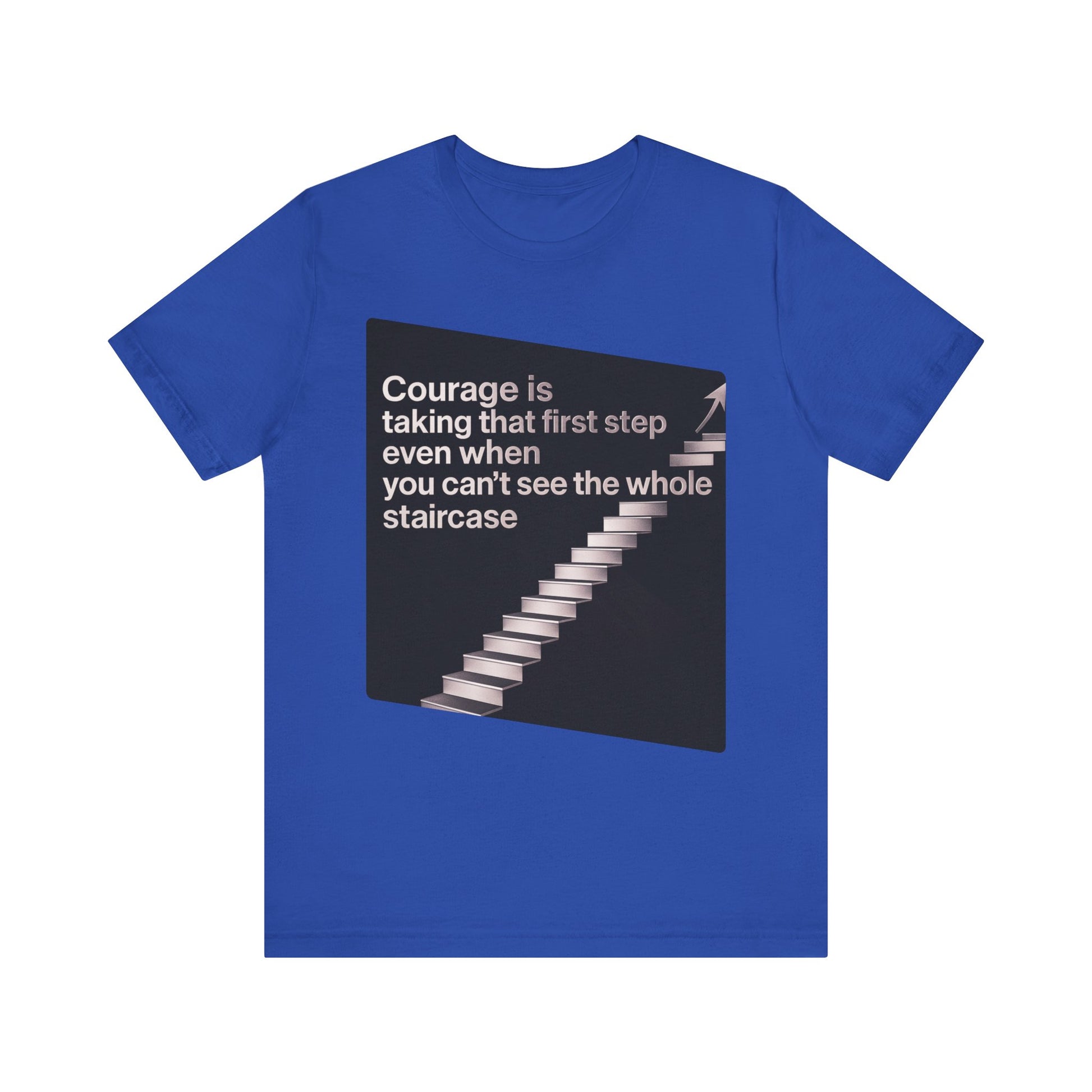 Introducing our Unisex Jersey Short Sleeve Tee, designed to inspire courage and motivate. This lightweight, breathable t-shirt is perfect for layering or wearing solo for a relaxed day out. The uplifting message, 'Courage is taking that first step even when you can't see the whole staircase,' resonates with anyone navigating life's challenges, making it a thoughtful gift for friends, family, or even yourself. Perfect for casual outings, motivational events, or as a commemorative piece for personal achievements. Whether you're celebrating a milestone or simply encouraging yourself to take that next step, this shirt brings positivity and comfort to your wardrobe, making it an ideal choice for holidays, birthdays, or any occasion that calls for a little extra motivation.