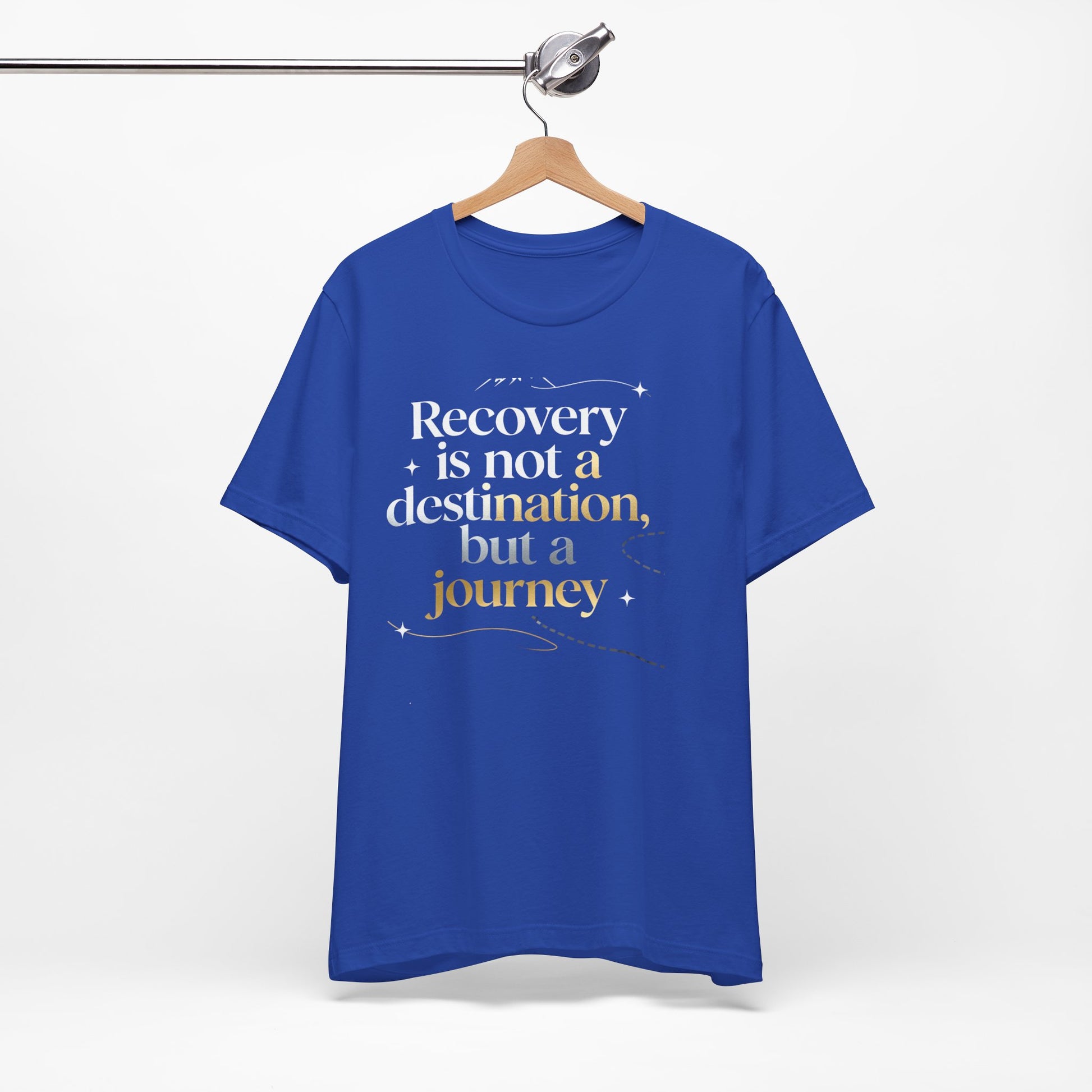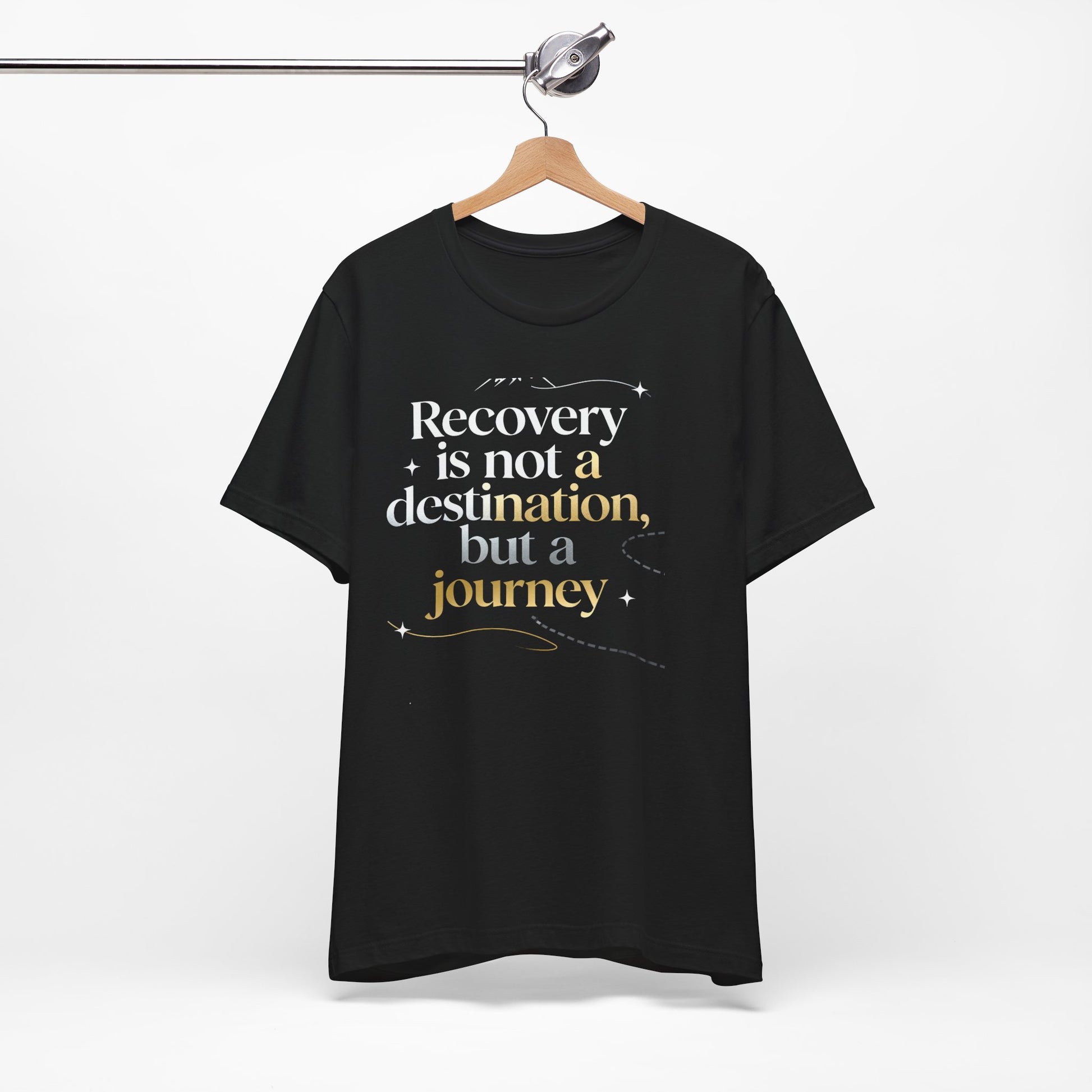 Embrace your journey with this stylish Unisex Jersey Short Sleeve Tee that resonates with both comfort and motivation. Featuring an inspiring mantra, "Recovery is not a destination, but a journey," this tee is perfect for those navigating life's ups and downs. Made from breathable 100% Airlume combed and ring-spun cotton, it's lightweight and incredibly soft, making it ideal for both active days and laid-back evenings. Its retail fit ensures versatility, allowing you to dress it up or keep it casual for various occasions, whether hanging out with friends or attending support group meetings. Perfect for adults who value comfort and an uplifting message, this tee is an excellent gift for holidays like Mental Health Awareness Month or during personal celebrations of recovery and progress. Let it be a staple in your wardrobe, reflecting your resilience while being fashionably comfortable.